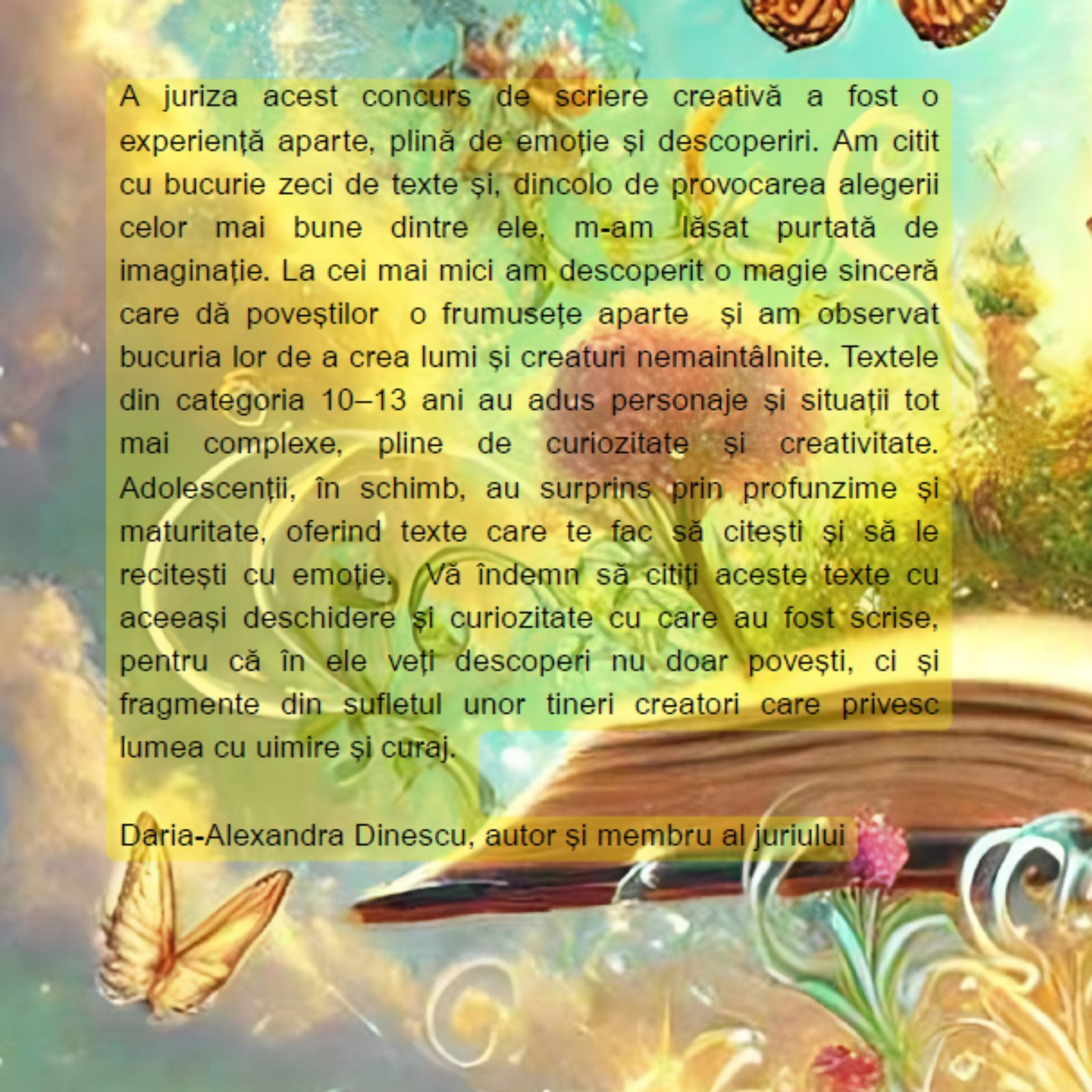 Această carte reunește tineri autori talentați, împărțiți pe 3 categorii de vârstă, selectați în urma concursului național de scriere creativă desfășurat în 3 etape, ediția a II-a. Fiecare poveste din volum a fost atent aleasă, editată și susținută cu grijă, pentru că fiecare copil merită să fie ascultat.